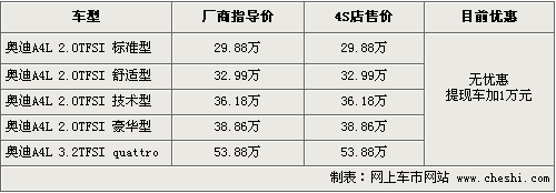 筆者從北京地區(qū)經(jīng)銷(xiāo)商處了解到,目前奧迪A4L現(xiàn)車(chē)供應(yīng)比較緊張,現(xiàn)車(chē)數(shù)量非常少,款式主要集中在2.0T舒適版和3.2兩款車(chē),各4S店供車(chē)情況有一定差異。部分店提現(xiàn)車(chē)仍然需要加1萬(wàn)元現(xiàn)金,或者在店內(nèi)做1萬(wàn)元裝飾。消費(fèi)者如果訂車(chē)的話,需要交5000元左右訂金,等待一個(gè)月時(shí)間提車(chē)。