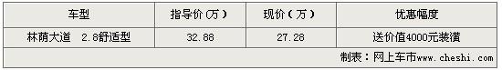 據(jù)林蔭大道銷售人員表示,購買林蔭大道 2.8舒適型除了可以得到最高5.6萬元的價格優(yōu)惠外,商家還在每輛車銷售的同時還搭配汽車裝潢贈品。商家現(xiàn)在展廳有黑色和炭晶兩款現(xiàn)車。更多詳情隨時聯(lián)系經(jīng)銷商。