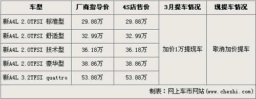 據(jù)北京地區(qū)奧迪經(jīng)銷店銷售人員介紹,近期購(gòu)買奧迪A4L的消費(fèi)者可以以原廠商指導(dǎo)價(jià)購(gòu)買,提現(xiàn)車不再需要多交1萬(wàn)元現(xiàn)金。在售的新A4L分為5款車型,售價(jià)分別為:2.0T標(biāo)準(zhǔn)型為29.88萬(wàn)元、2.0T舒適性為32.99萬(wàn)元、2.0T技術(shù)型為36.18萬(wàn)元、2.0T為38.86萬(wàn)元、3.2Quattro為53.88萬(wàn)元。銷售人員還介紹,新A4L的內(nèi)飾分灰色、黑色和米色三種,一般車色均配以米色和灰色內(nèi)飾,只有紅色車身的新A4L配以黑色內(nèi)飾,店內(nèi)只有紅色車型數(shù)量不多,欲購(gòu)買其他顏色的消費(fèi)者需交定金1萬(wàn)元,約等1個(gè)月后提車。