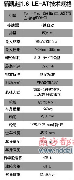 新凱越沿用了舊款車型的動(dòng)力系統(tǒng),不過經(jīng)過重新調(diào)校之后,其1.8升和1.6升DOHC16VTwin-Tec引擎都達(dá)到了歐IV排放標(biāo)準(zhǔn)。我們此次試駕的車型配備了1.6升發(fā)動(dòng)機(jī),在6000轉(zhuǎn)時(shí)可達(dá)到78kW的最大功率;在3600轉(zhuǎn)時(shí),提供146Nm的最大扭矩,在同級(jí)車型當(dāng)中表現(xiàn)居中。傳動(dòng)系統(tǒng)上,與這款1.6升四缸引擎相匹配的是一臺(tái)鋸齒形排列的4速自動(dòng)變速箱。從廠家提供的資料上看,為了獲得更好的經(jīng)濟(jì)性能,這款變速器配備有“智能切換空擋”功能。