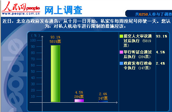 截至10月6日,共有6000余網(wǎng)友參加了我們的網(wǎng)上投票。其中,93.1%的網(wǎng)友認(rèn)為私車(chē)限行應(yīng)提交人大審議通過(guò)后執(zhí)行;4.5%人認(rèn)為這項(xiàng)決策應(yīng)舉行聽(tīng)證會(huì)通過(guò)后執(zhí)行;僅有2.4%的網(wǎng)友認(rèn)為限行可以由政府發(fā)布行政命令執(zhí)行。