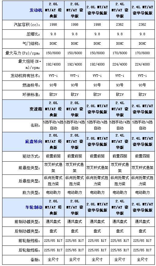 此次上市的國(guó)產(chǎn)RAV4最少將會(huì)推出10款車(chē)型,其中包括2.0L經(jīng)典版、2.0L豪華版、2.0L豪華導(dǎo)航版、2.4L豪華版、2.4L豪華導(dǎo)航版,其中每款新車(chē)都會(huì)推出自動(dòng)擋和手動(dòng)擋車(chē)型,并且同車(chē)型的手動(dòng)擋和自動(dòng)擋車(chē)型的配置完全一樣,另外2.0L全部為前驅(qū)車(chē)型,2.4L全部為四驅(qū)車(chē)型,新車(chē)還會(huì)有五種顏色分別為:白色、銀灰色、米黃色、深紅色和深藍(lán)色。