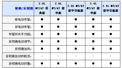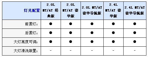 此次推出的10款新車(chē)全部配備鹵素前大燈并且?guī)в写鬅羰謩?dòng)高低調(diào)節(jié)功能,后尾燈標(biāo)配LED燈組并且配備高位剎車(chē)燈,2.4L車(chē)型將會(huì)使用鍍鉻格柵和2.0L車(chē)型前臉將會(huì)有一定的區(qū)別,另外入門(mén)級(jí)車(chē)型即經(jīng)典版車(chē)型不帶天窗;其它車(chē)型為標(biāo)配,2.4L所有車(chē)型標(biāo)配頂部行李架;但是2.0L車(chē)型則不會(huì)配備。