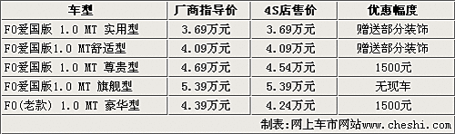 據(jù)比亞迪汽車4S店銷售人員介紹,現(xiàn)在比亞迪F0愛國(guó)版igo系列車型的現(xiàn)車比較齊全,只有旗艦型沒有現(xiàn)車,但消費(fèi)者可以預(yù)訂。售價(jià)3.99萬(wàn)元的老款舒適型現(xiàn)在已經(jīng)停產(chǎn),而老款豪華型目前還有部分現(xiàn)車銷售。另外,比亞迪FO老款豪華型和尊貴型目前都可以優(yōu)惠現(xiàn)金1500元,實(shí)用型和新舒適型只可以贈(zèng)送部分裝飾。