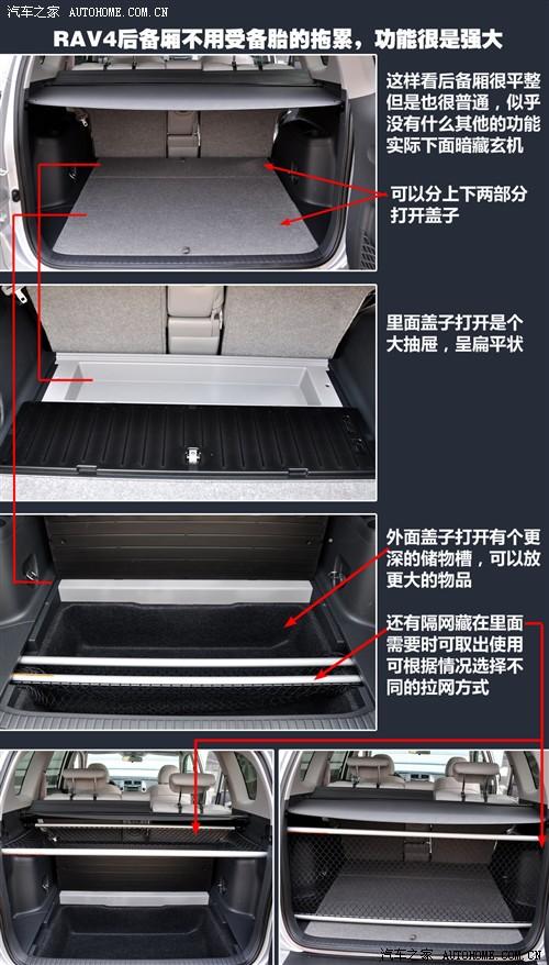 最強大的是RAV4的后備廂,首先側開的尾門本身就比較方便,只是針對關面我們提到過的車門鉸鏈強度問題后續(xù)還要進行關注。后備廂非常平坦,得益于備胎外掛的形式,儲物能力也非常強。地板可以分兩部分打開,靠里面的打開是類似一個抽屜的儲物格,靠外面的則是比較深的一個大儲物槽,同時還有隔離網(wǎng)袋可以取出來用,分兩種方式掛在廂壁上的掛鉤上,將后備廂分隔開來,方便固定物品。