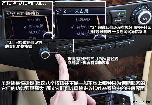 還有一點比較有意思的是,寶馬5系的中控臺面板上DVD槽下方帶有8個快捷鍵,一般來說這些快捷鍵是服務于音響系統(tǒng),用來存儲電臺或選擇CD的,但在這里它們的功能要比我們想象中的更強大。當我們停留在任何iDrive系統(tǒng)界面時,都可以通過長按一個快捷鍵來將該界面存儲下來,舉個例子,當我在iDrive系統(tǒng)中調(diào)節(jié)到“已存儲電臺”這個界面時,我長按快捷鍵1就可以將“已存儲電臺”界面存儲下來,以后如果我想調(diào)出“已存儲電臺”界面時只要按下快捷鍵1就行了,非常方便。