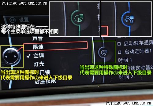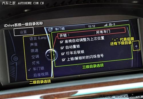 當我們進入“設(shè)置”選項的二級目錄時,在二級目錄的左右兩邊我們可以看到兩種不同的圖標。左邊的圓形帶有兩個小箭頭的圖標表示如果想進入左側(cè)的上級目錄需要使用②撥動方式向左撥動旋鈕進入,而右邊的特殊圖標表示如果想進入右側(cè)的下級目錄需要使用③向下按的方式進入?偟膩碚f,這種左右分列的目錄形式比老款要更符合人們的日常習慣,因此比老款iDrive系統(tǒng)更容易得到用戶的認可。