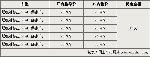 據(jù)4s店銷售人員介紹,目前店內(nèi)銷售的新超級維特拉全系優(yōu)惠5000元。低配的3門版2.4L 5速手動車型最低售價降為20.4萬元,而排量稍大采用5速自動變速器的5門版3.2L車型經(jīng)優(yōu)惠后售價也降為33.4萬元,是全系最高價。店內(nèi)現(xiàn)車顏色方面,新超級維特拉有黑、灰、白三個顏色供消費者選購。
