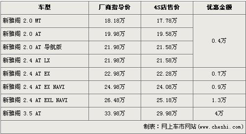 據(jù)4S店銷售人員介紹,目前新雅閣全系優(yōu)惠最高達(dá)到了4萬元。新雅閣分為2.0、2.4、3.5三個排量,全系最低配的2.0手動版經(jīng)4000元優(yōu)惠后售價降到了17.78萬元,2.4L車型高配的EXL NAVI版經(jīng)1.3萬元優(yōu)惠后售價降到了25.18萬元,而3.5排量車型優(yōu)惠4萬元達(dá)到了全系的最高。銷售人員還介紹,除了最低配的車型無現(xiàn)車外,其他車型均有現(xiàn)車。