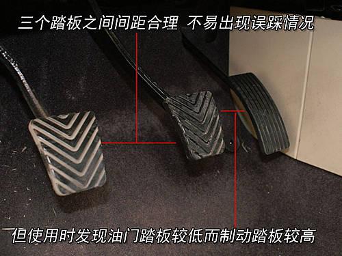 油門以及各個(gè)踏板設(shè)計(jì)的間距較大,不用擔(dān)心誤踏情況的發(fā)生。實(shí)際使用過程中發(fā)現(xiàn)各個(gè)踏板的高度并不統(tǒng)一,這點(diǎn)需要慢慢的適應(yīng)。