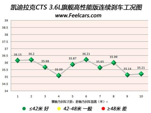 再來(lái)看看新CTS的連續(xù)10次剎車成績(jī),最差成績(jī)?yōu)?6.21米,與最好成績(jī)差距僅為1.1米,且大部分成績(jī)均在36米以內(nèi),說(shuō)明新CTS的剎車系統(tǒng)散熱效果非常好,始終保持在最佳的工作狀態(tài),沒(méi)有出現(xiàn)熱衰減現(xiàn)象。