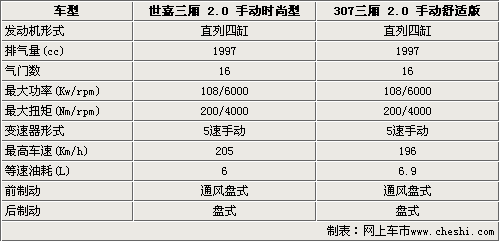 東風雪鐵龍世嘉三廂和標致307動力系統(tǒng)相同,都是2.0升直列4缸發(fā)動機并且同時運用了電子節(jié)氣門技術,該技術可以能根據(jù)駕駛員的需求愿望以及整車各種行駛狀況確定節(jié)氣門的最佳開度,保證車輛最佳的動力性和燃油經濟性。兩款車型的動力輸出完全一樣,但是由于各自的整備質量和設計不同,所以在最高時速和油耗上有所區(qū)別。兩款車型的變速系統(tǒng)均是5速手動變速箱。制動方式兩款車型均為前通風盤式后實心盤式的剎車。