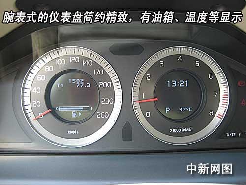 腕表式的儀表盤簡約精致,沒有炫麗的燈光效果,看上去并不起眼。剩余油量和可行駛里程以數(shù)字方式顯示在車速表中央,當(dāng)前時(shí)間、外界氣溫及檔位顯示在轉(zhuǎn)速表中央。所有儀表信息都采用中文顯示。