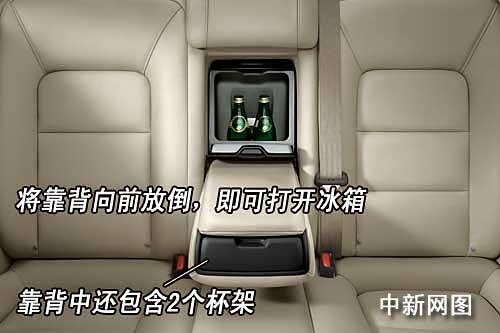 在后座中間座位靠背后方有一個(gè)冰箱。將靠背向前放倒,即可打開(kāi)冰箱,同時(shí),靠背中還有2個(gè)杯架,方便乘客在旅途中放杯子。