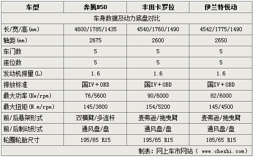 一汽奔騰新款轎車-B50即將在5月16日正式上市,作為向下擴(kuò)展的重要車型,它被一汽寄予了很大的期待。而在同級(jí)市場(chǎng)當(dāng)中還有很多1.6車型很具有競(jìng)爭(zhēng)力,比如日系的卡羅拉以及韓系的伊蘭特悅動(dòng)。作為國(guó)產(chǎn)車的奔騰B50到底與這些車型相比有那些優(yōu)勢(shì)呢?這里就將這款即將上市的新車與他們做一個(gè)詳細(xì)的配置對(duì)比,看看三款車型到底區(qū)別在那里。