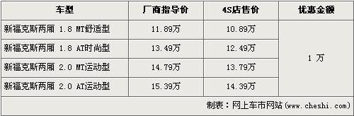 據(jù)長(zhǎng)安福特經(jīng)銷商處銷售人員介紹,兩廂新款福克斯全系優(yōu)惠1萬(wàn)元。兩廂新款?怂狗譃1.8L和2.0L兩種排量,入門級(jí)車型的1.8L手動(dòng)舒適版經(jīng)優(yōu)惠后,售價(jià)為10.89萬(wàn)元。高配的2.0L自動(dòng)運(yùn)動(dòng)版售價(jià)降到了14.39萬(wàn)元。