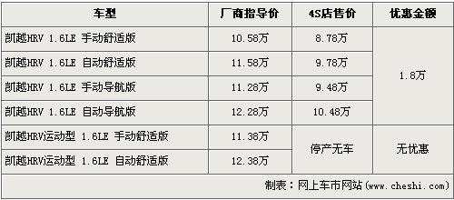 據(jù)經(jīng)銷商處銷售人員介紹,凱越HRV共有6個(gè)車型,由于運(yùn)動(dòng)版車型現(xiàn)已停產(chǎn),經(jīng)銷店內(nèi)已經(jīng)沒有現(xiàn)車,所以在售的車型只有舒適版和導(dǎo)航版共4款車型。近期購(gòu)買凱越HRV的消費(fèi)者可以得到1.8萬(wàn)元的現(xiàn)金優(yōu)惠,經(jīng)優(yōu)惠后,入門級(jí)的1.6LE 手動(dòng)舒適版車型售價(jià)從廠商指導(dǎo)價(jià)10.58萬(wàn)元跌至8.78萬(wàn)元。