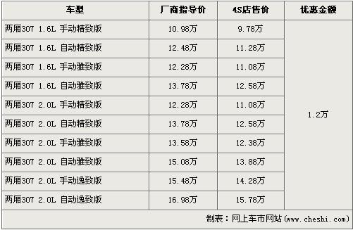據(jù)東風(fēng)標(biāo)致經(jīng)銷店銷售人員介紹,兩廂標(biāo)致307分為1.6L和2.0L兩種排量,目前優(yōu)惠1.2萬(wàn)元,入門車型的1.6L 手動(dòng)精致版原廠商指導(dǎo)價(jià)為10.98萬(wàn)元,經(jīng)優(yōu)惠后僅售9.78萬(wàn)元,排量稍大的2.0L排量的低配車型手動(dòng)精致版經(jīng)優(yōu)惠后售價(jià)為11.08萬(wàn)元,F(xiàn)車方面,1.6L車型現(xiàn)車充足,2.0L車型則現(xiàn)車緊張,挑選空間不大。