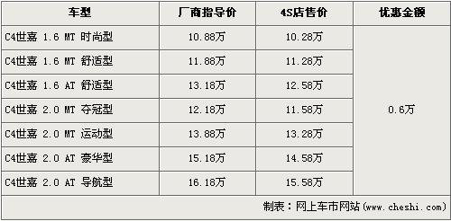 據(jù)經(jīng)銷商處銷售人員介紹,C4世嘉全系優(yōu)惠金額6000元。目前,C4世嘉全系最低配的1.6L手動(dòng)時(shí)尚型售價(jià)從原廠商指導(dǎo)價(jià)10.88萬(wàn)元降至10.28萬(wàn)元,黑內(nèi)飾的2.0L手動(dòng)運(yùn)動(dòng)型售價(jià)也降至到了13.28萬(wàn)元。銷售人員還介紹,目前店內(nèi)現(xiàn)車以銀色、紅色為主。