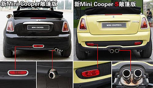 在車輛尾部,新一代Mini Cooper和Mini Cooper S敞篷版的差異也顯而易見。新一代Mini Cooper敞篷版的保險杠單霧燈和左側(cè)單排氣管設(shè)計,均被新一代Mini Cooper S敞篷版上的保險杠雙霧燈和中置雙排氣管所替代,而尾部“Cooper S”的LOGO就更不用說了。