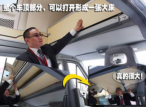上面圖片中工作人員正在向記者演示隱藏在車頂?shù)碾p人床,在平時這張雙人床是隱藏的看不見的。此時在車輛中后部都可以擁有非常不錯的縱向空間,即便身高在1.8米以上的乘員也不會感覺到頭頂?shù)膲阂帧?/p>