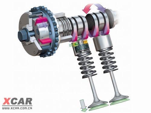 以上所述發(fā)動機可變氣門正時系統(tǒng),是通過微機控制可變氣門調節(jié)器上升和下降獲得齒形皮帶輪與進氣凸輪(進氣門)的相對位置變化,這種結構屬于凸輪軸配氣相位可變結構,一般可調整20!30。曲軸轉角。由于這種機構的凸輪軸、凸輪形線及進氣持續(xù)角均不變,雖然高速時可以加大進氣遲閉角,但是氣門疊開角卻減小,這是它的缺點。