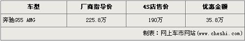 根據(jù)北京奔馳4S店銷售人員介紹,目前奔馳G55 AMG現(xiàn)金優(yōu)惠35.8萬元。經(jīng)優(yōu)惠后,奔馳G55 AMG售價從廠商指導(dǎo)價的225.8萬元下降到了190萬元。銷售人員還介紹,目前店內(nèi)無奔馳G55 AMG現(xiàn)車,欲購此車的消費者需交訂金10萬元,最早2個禮拜可提車。