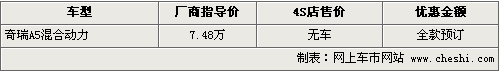 據(jù)4S店銷售人員介紹,奇瑞A5混合動(dòng)力車型目前銷量很少,但仍有少量夠買者。消費(fèi)者如果購(gòu)車的話需要全款訂車,這款車的售價(jià)為7.48萬(wàn)元。