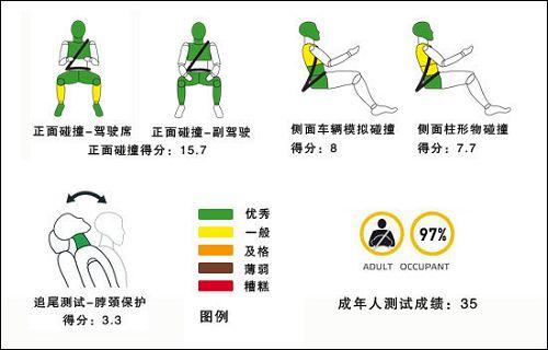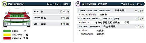 上圖描述的是車輛對于路人的保護(hù)情況和安全輔助設(shè)備配置情況。路人安全在歐洲已經(jīng)普遍重視,很多檢測項目已經(jīng)有了很清晰的標(biāo)準(zhǔn)。圖中看出,高爾夫6代翼子板部分對行人傷害是比較重的。在安全配置方面,高爾夫6代標(biāo)配了ESC,也就是我們國內(nèi)常說的ESP,不知道國產(chǎn)版本會不會“偷工減料”。駕駛席和副駕駛的安全帶提醒裝置都為高爾夫6代的最終成績做了加分。