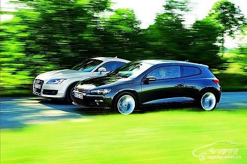 當(dāng)“尚酷”吹來時,情況變了。這是一位血緣相同的異姓兄弟,同樣來自PQ35平臺,同樣是轎跑車,一身平民裝束讓它看起來就像是一位起義領(lǐng)袖。雖然它登臺的目的不是要窩里反,可是這無疑給了我們這些成天琢磨汽車的好事者一個制造“爭端”的機會。于是TT 1.8TFSI和尚酷1.4TSI就被強迫上了擂臺。