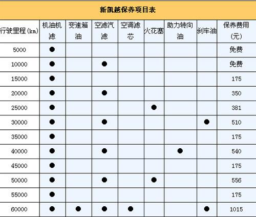 新凱越每次的保養(yǎng)間隔為5000km,首保免費。保修政策為2年/6萬公里保修(以先到為準)。為了方便計算,我們以一年行駛2萬km為標準,那么新凱越一年要做四次保養(yǎng)。由下表可知其一年保養(yǎng)費用1400元。
