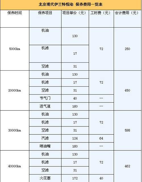 悅動的首保為5000km,以后每次的保養(yǎng)間隔為5000km。保修政策為2年/6萬公里保修(以先到為準)。第二次的10000km保養(yǎng)和首保內容相同。那么如果一年行駛2萬km,悅動一年要做四次保養(yǎng)。由下表可知其除了第一年,以后每年的保養(yǎng)費用1500元。