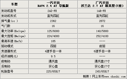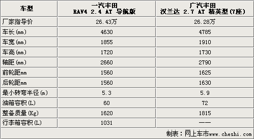 SUV市場(chǎng)一直是車市中增長(zhǎng)比較強(qiáng)勁的一股力量,尤其是受到都市人喜愛(ài)的城市SUV車型。在新車層出不群的同時(shí),競(jìng)爭(zhēng)也在逐漸加大。豐田汽車就看準(zhǔn)了這一市場(chǎng),在今年上半年分別于一汽豐田和廣汽豐田,投產(chǎn)了兩款城市SUV車型:RAV4和豪華城市SUV漢蘭達(dá),售價(jià)分別為18.98萬(wàn)—26.43萬(wàn)和24.88-42.98萬(wàn)元。從兩款車型的售價(jià)上看,在25萬(wàn)這個(gè)價(jià)格區(qū)間都有車型銷售。那么這兩款同品牌、同價(jià)位不同級(jí)別的城市SUV,它們都各自有什么特點(diǎn)和優(yōu)勢(shì)呢?為了能讓您可以更加清楚地了解它們,我們選取了一汽豐田RAV4 2.4自動(dòng)導(dǎo)航版和廣汽豐田漢蘭達(dá)2.7精英型7座這兩款車型,來(lái)做一個(gè)全方位的對(duì)比。一汽豐田RAV4 2.4自動(dòng)導(dǎo)航版售價(jià)為26.43萬(wàn)元,廣汽豐田漢蘭達(dá)2.7精英型7座的售價(jià)為26.28萬(wàn)元,兩款車型的售價(jià)僅相差了1500元。