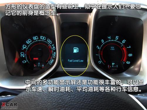 方形的儀表盤的造型有些前衛(wèi),似乎在提示人們不要忘記它的前身是概念車。中間的多功能顯示屏還是功能很豐富的,可以顯示車速、瞬時(shí)油耗、平均油耗等各種行車信息。在右側(cè)紅區(qū)表底9000轉(zhuǎn)的轉(zhuǎn)速表內(nèi),可以看到SS的小logo。左邊的時(shí)速表實(shí)在有些不夠讓人心動(dòng),為什么這么說呢,因?yàn)闀r(shí)速表的表底數(shù)值為180,難道Camaro SS這么強(qiáng)大超級(jí)跑車最高時(shí)速只能達(dá)到180公里/時(shí),不是之前官方說288公里/時(shí)嗎?據(jù)工作人員介紹,180的極限數(shù)值是針對(duì)美國所使用的英里速度單位來定的,而時(shí)速表內(nèi)的速度單位可通過行車電腦進(jìn)行變換,所以也導(dǎo)致Camaro SS在公里/時(shí)的速度單位下,很容易就超出表底180的最高車速,雖然對(duì)于那些喜歡挑戰(zhàn)極速的人來說180公里/時(shí)實(shí)在是毫無難度,但能夠如此輕松爆表還是非常具有樂趣的。