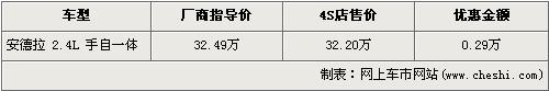 據(jù)4s店銷售人員介紹,目前歐寶安德拉現(xiàn)金優(yōu)惠2900元,在售的2.4L 手自一體車型售價(jià)經(jīng)優(yōu)惠后降為了32.20萬(wàn)元。本車外觀共有白、乳白、黑、灰、銀、藍(lán)6種顏色,內(nèi)飾有黑、棕兩種顏色,總共12種顏色搭配供消費(fèi)者選擇。銷售人員還介紹,店內(nèi)現(xiàn)車比較有限,以灰色和藍(lán)色為主,其他顏色需預(yù)訂。