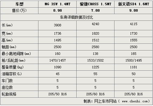 三款車(chē)的車(chē)體尺寸差距較明顯,不論外觀尺寸還是軸距均有所不同,駿捷的長(zhǎng)/寬/高三項(xiàng)均明顯優(yōu)于名爵MG3與天語(yǔ),而軸距方面也是駿捷CROSS更勝一籌,所以三車(chē)的內(nèi)部空間相比起來(lái)自然是剛剛上市的駿捷CROSS更寬大一些。其它方面如輪轂輪胎尺寸則相差不多,三車(chē)輪胎寬度均符合跨界車(chē)的多面性要求。