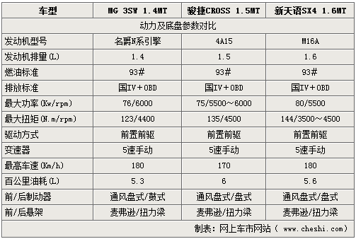 在動(dòng)力方面,三款車(chē)型的排量分別為1.6L,1.5L以及1.4L,在排量不同的基礎(chǔ)上,天語(yǔ)以及名爵MG3在功率輸出方面表現(xiàn)更佳,而駿捷CROSS則在扭矩的輸出方面表現(xiàn)的較為突出。最高車(chē)速方面三車(chē)相差僅10公里/每小時(shí),底盤(pán)的懸架設(shè)計(jì)也基本一致,但是駿捷CROSS的前后盤(pán)式制動(dòng)顯然要優(yōu)于MG3的前盤(pán)后鼓的制動(dòng)設(shè)計(jì),而排量更高的天語(yǔ)則凸顯了日系車(chē)的油耗優(yōu)勢(shì)。