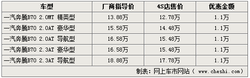 各家銷售人員均表示北京各個展廳內(nèi)09款奔騰B70現(xiàn)車充足,現(xiàn)在購車的消費者將最高享受到1.1萬元現(xiàn)金優(yōu)惠。據(jù)了解,此車型銷售較快的型號主要是2.0L的導(dǎo)航版車型,以及2.3L高配的兩款車型。