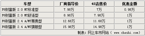 據(jù)銷售人員介紹,目前比亞迪F6財富版全系可最高優(yōu)惠萬元現(xiàn)金。在售車型涵蓋4款車型兩個排量,2.0L的兩款手動車型以及2.4L的兩款自動檔車型。購車同時還有部分內(nèi)外裝飾或保養(yǎng)優(yōu)惠贈送。