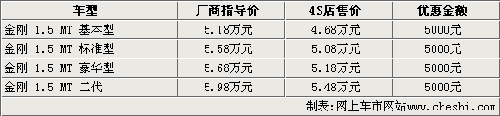 據(jù)北京地區(qū)吉利4S店銷售人員介紹,新一代金剛已經(jīng)上市,前臉及大燈等地方都有變化,售價(jià)5.98萬(wàn)元。另外還有老款金剛,一共有四款車型,目前金剛的現(xiàn)車比較充足,全系都可以優(yōu)惠五千元。