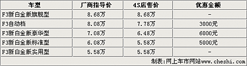 據(jù)比亞迪汽車4S店銷售人員表示,比亞迪F3本次降價(jià)的旗艦型和實(shí)用型都沒(méi)有車,而且無(wú)法接受預(yù)訂。不過(guò)標(biāo)準(zhǔn)型、豪華型和自動(dòng)擋車型目前都有較大的優(yōu)惠幅度,其中豪華型和標(biāo)準(zhǔn)型分別可以優(yōu)惠6000元和5000元。而F3自動(dòng)擋因?yàn)楝F(xiàn)車比較少,目前的優(yōu)惠幅度只有3000元。