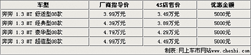 據(jù)銷售人員介紹,奔奔08款目前現(xiàn)車比較齊全,而且優(yōu)惠幅度比前一段時(shí)間也有了提高。原來購(gòu)買奔奔08款只能贈(zèng)送購(gòu)置稅,隨著銷售壓力及市場(chǎng)競(jìng)爭(zhēng)的不斷提高,目前奔奔08款最高可以優(yōu)惠五千元。