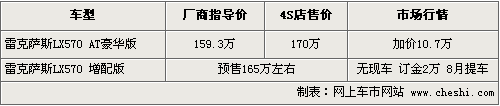 筆者目前從雷克薩斯經(jīng)銷商處了解,雷克薩斯LX570因產(chǎn)能有限,貨源供應(yīng)非常緊張。目前基本是訂單式銷售,而提現(xiàn)車的話加價(jià)金額則超過了10萬元。同時(shí),雷克薩斯LX570增配版車型將于8月份到店,銷售人員介紹,增配版車型將增加智能副駕系統(tǒng),同時(shí)在內(nèi)飾和外觀上也有小幅的變化,預(yù)計(jì)售價(jià)在165萬左右。具體售價(jià)目前尚未公布,現(xiàn)在消費(fèi)者訂車需要2萬元定金,一個(gè)月左右方可提車。