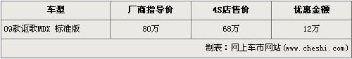 據(jù)經(jīng)銷商銷售人員介紹,09款謳歌-MDX的現(xiàn)金優(yōu)惠12萬元,優(yōu)惠后售價(jià)也從原廠商售價(jià)80萬降到了68萬,首次跌破了70萬元。銷售人員還介紹,09款謳歌MDX增加的實(shí)用性的配件包括前下護(hù)板和后下護(hù)板,能避免惡劣路況對底盤帶來的損傷,并且09款謳歌MDX還新增了巴厘海藍(lán)和摩卡褐金兩種顏色,店內(nèi)現(xiàn)車非常充足,顏色也比較全,欲購買者挑選的空間非常大。
