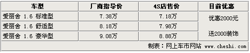 據(jù)4S店銷售人員介紹:目前新愛麗舍最高優(yōu)惠達2000元,店內(nèi)另送2000元裝飾。目前新愛麗舍現(xiàn)車非常充足,顏色齊全,白色、銀色等暢銷的顏色可供挑選。