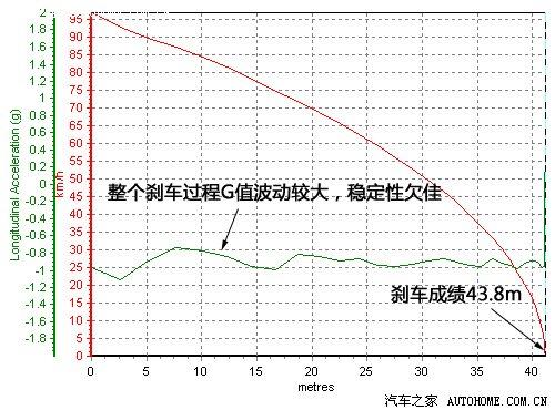 但43.8米的成績只處在我們認(rèn)為合格的范圍內(nèi),離優(yōu)秀尚有不小的距離。究其原因,我們阻礙剎車更好表現(xiàn)的因素和1.8L相同,即懸掛無法給予車身足夠的支撐,重心過度向前偏移使得后輪附著力下降,四輪盤式剎車的作用一下變小了很多。
