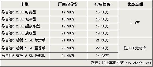 據(jù)4S店銷售人員介紹,目前馬自達(dá)6銷售的車型除了新款睿翼外,還有老款車型有現(xiàn)車供應(yīng),消費(fèi)者到店購(gòu)車可得到2.4萬元的現(xiàn)金優(yōu)惠,車價(jià)最低僅為15.58萬元。新款馬自達(dá)6睿翼雖然沒有現(xiàn)金方面優(yōu)惠,但購(gòu)車可以贈(zèng)送3000元左右的裝飾,消費(fèi)者可以根據(jù)需求選購(gòu)。