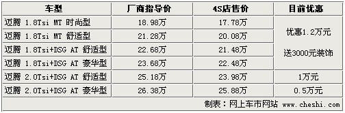 據(jù)4S店銷售人員介紹:目前邁騰最高優(yōu)惠1.2萬元,店內(nèi)購車還可送3000元裝飾,裝飾包括地膠、腳墊、汽車防爆膜等。目前邁騰現(xiàn)車充足,1.8Tsi車型銷量較好,所以車源較為豐富,但2.0Tsi豪華型無現(xiàn)車需預(yù)定,預(yù)定需等20天左右。由于2.0Tsi兩款車型銷量較少,所以優(yōu)惠幅度較少,如果您對(duì)動(dòng)力性要求不是非常高的話,1.8Tsi車型可以滿足您的需求,建議購買。