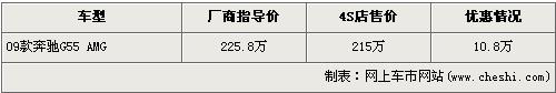 根據(jù)北京奔馳4S店銷售人員介紹,奔馳G55 AMG近期有10.8萬元的優(yōu)惠,經(jīng)優(yōu)惠09款奔馳G55 AMG的售價從225.8萬元下降到了215萬元。現(xiàn)車方面,店內(nèi)目前還有一輛黑色現(xiàn)車,錯過此車的消費者需交10萬元訂金,約等半年后才可提車。