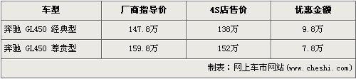 據(jù)經(jīng)銷商處銷售人員介紹,目前國內(nèi)在售的奔馳GL級(jí)分為GL450 經(jīng)典版與GL450 尊貴版,近日奔馳GL系的最高優(yōu)惠9.8萬元。經(jīng)9.8萬元優(yōu)惠后,低配的GL450經(jīng)典版售價(jià)降到了138萬元。高配的尊貴版經(jīng)7.8萬元優(yōu)惠后,售價(jià)從159.8萬元降到了152萬元。